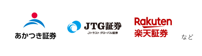 あかつき証券、いちよし証券、楽天証券 他 ※上場株式等を当社に口座振替してのご利用も可能です。 |
